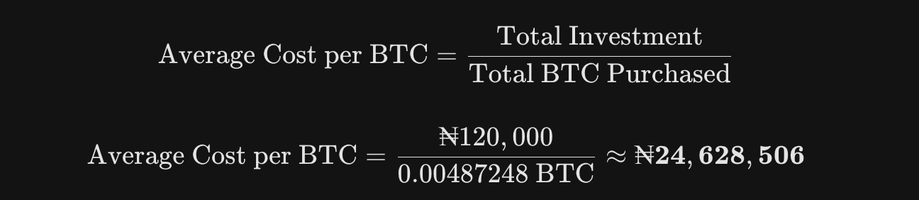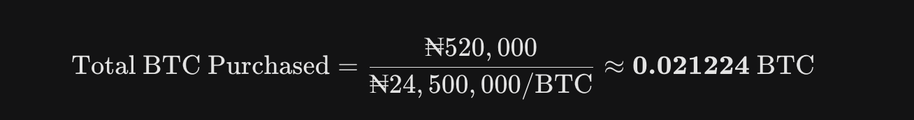 - Total BTC purchased (Estimate): Based on the superior cost-averaging above, let's assume your final average cost over the volatile year is ₦24,500,000 per BTC.