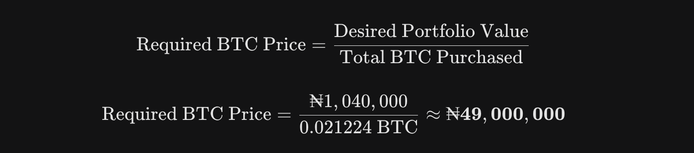 - The required exit price: What price would BTC need to reach at the end of the year for your 0.021224 BTC to be worth ₦1,040,000?