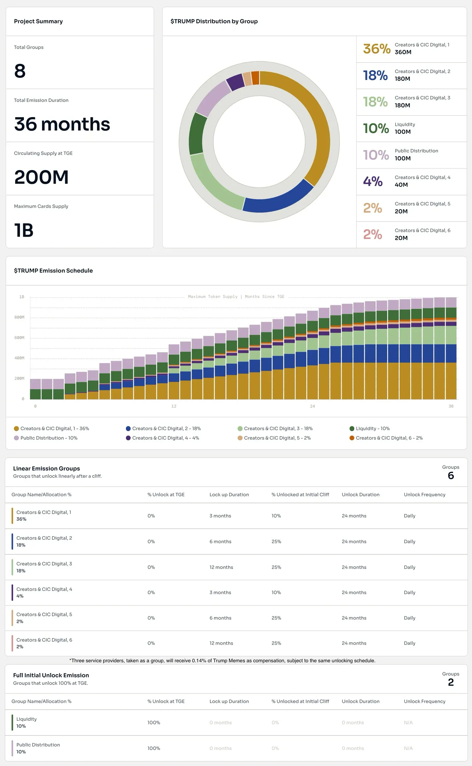 There are 200 million $TRUMP available on day one, and this will grow to a total of 1 billion $TRUMP over three years. Each group's allocation is released on their schedule over 3 years. See the image below