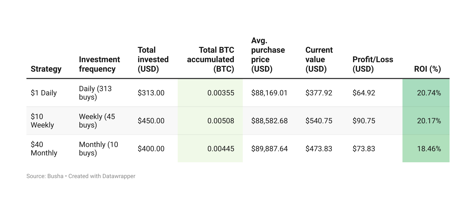 Because you bought a tiny amount every day, your entries were spread widely across all the ups and downs. Even when Bitcoin was expensive, you only bought $1 worth, which protected you from overpaying. This approach gave the lowest average cost among the three strategies.