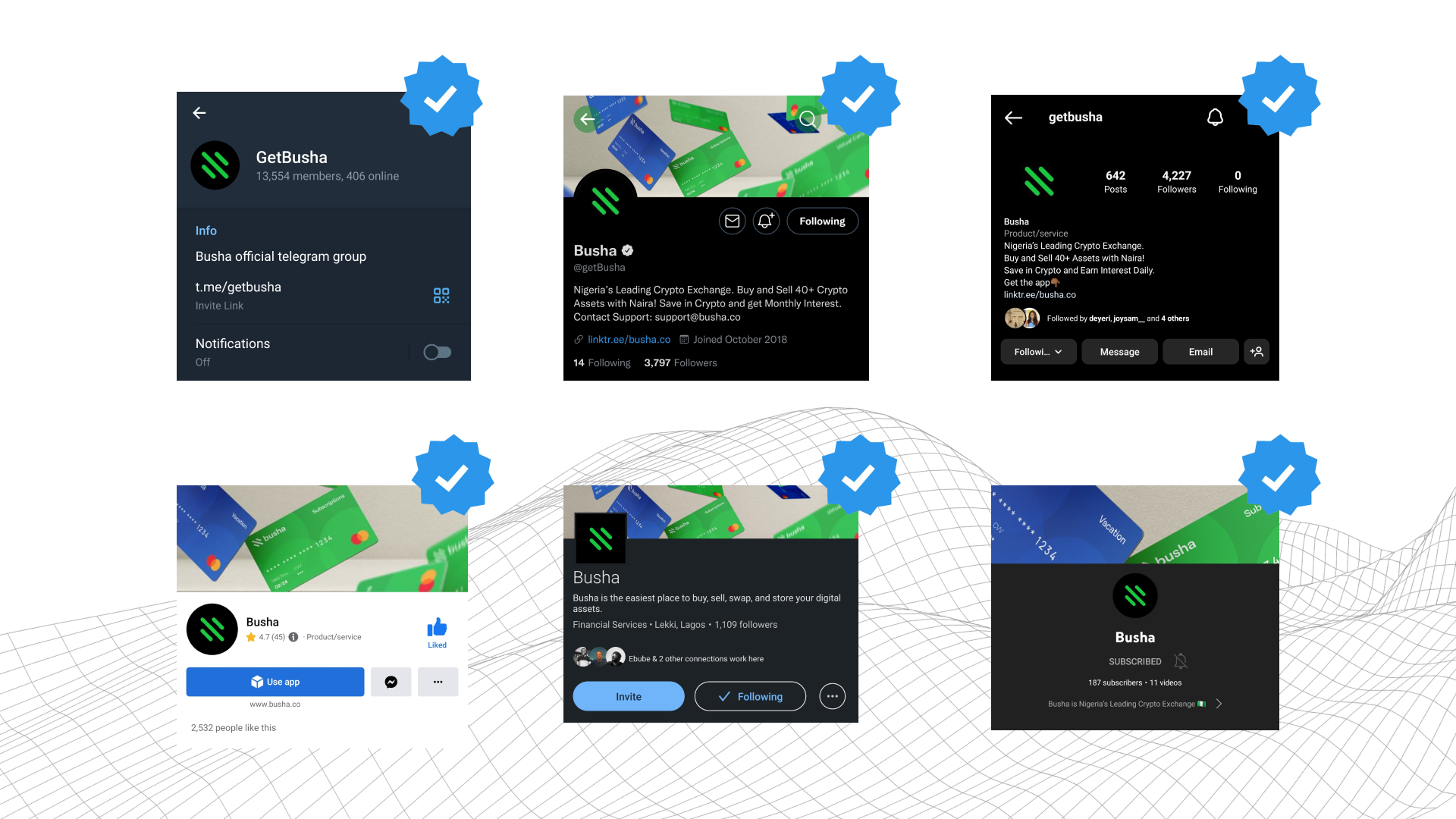 - The Busha team would never call you to reset your password or ask for your OTP or pin.